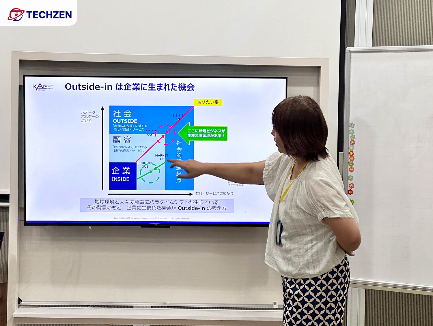 訪問の一環として、TechzenではSDGs(持続可能な開発目標)に関する基礎講座を開催した。講師は、山城学院の代表である花輪先生が務められた。